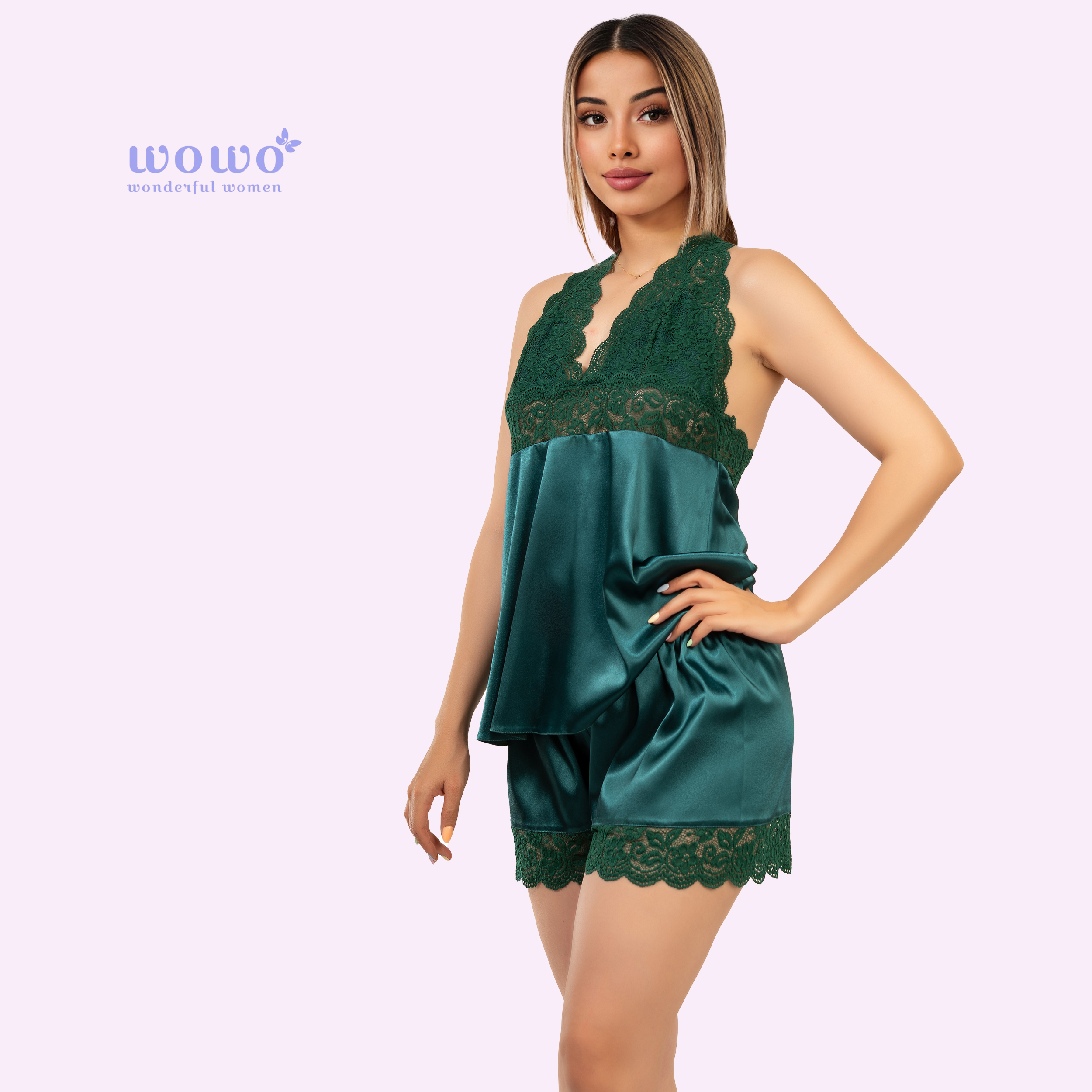 The matching shorts are made from soft, glossy satin, featuring lace-trimmed hems that complete the set with a harmonious and stylish finish.