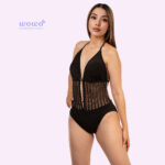 This elegant one-piece swimsuit features a modern halter-style top with a front ring and an asymmetric cut-out design, creating a unique and eye-catching look.The halter neckline elongates the upper body, while the front ring adds a refined touch and helps the swimsuit sit neatly on the body.The lower part of the swimsuit is designed with a mid-leg cut, which provides the perfect balance between coverage, comfort, and style.This cut is one of the most popular choices because it stays in place during movement and offers a naturally flattering shape.If you’re looking for a swimsuit that’s stylish, flattering, comfortable, and practical for swimming, this design is an excellent choice.Made from high-quality swimwear fabric, this swimsuit is resistant to chlorine, saltwater, and sunlight.It maintains its elasticity and color even with frequent use, while the soft and flexible texture ensures full comfort during swimming and long wear. -