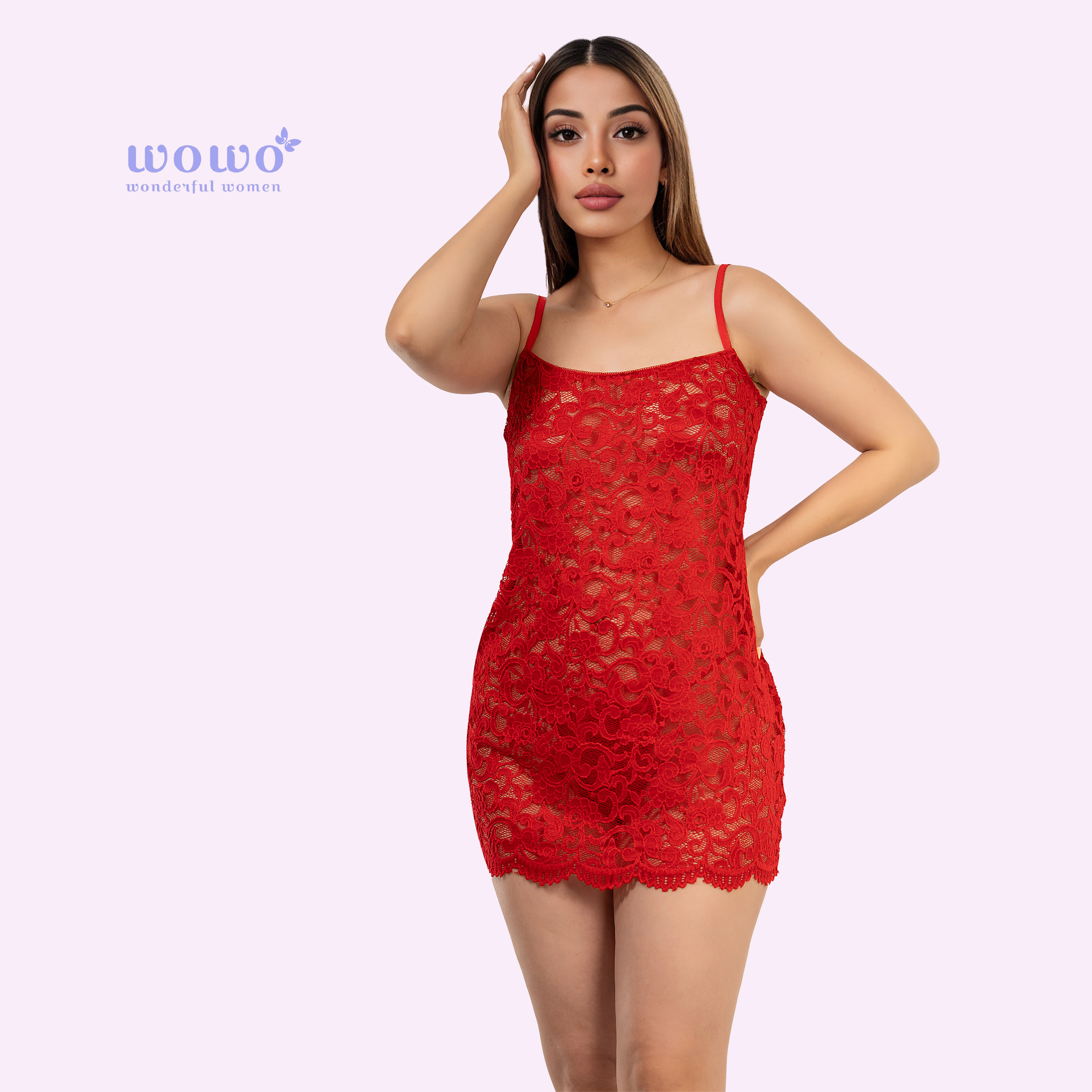 - Short nightdress made of sheer lace fabric